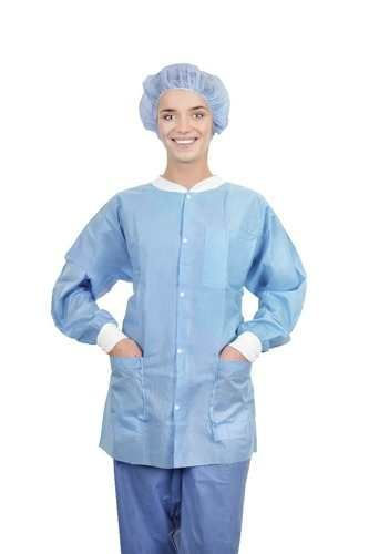 The Soft Disposable Elastic Long-Sleeve Warm-up Jacket keeps your hospital staff warm, protected from light fluid splashes and looking professional in the cooler open spaces of the healthcare facility, operating theatre or laboratory. Our 35-gsm SMS fabric is fluid-resistant and breathable because it keeps the body warm in low temperatures and cools the body in high temperatures—providing an optimal mix of protection and comfort. For more comfort and to prevent the sleeves from rolling, the jacket integrates a knitted collar and cuffs. Also, on the practical side, three reinforced pockets are integrated. Finally, for more flexibility and a better fit to users’ morphology, the gown integrates an elasticated waist. It is available in blue and in a wide range of sizes, from S to XL. The Soft Disposable Elastic Long-Sleeve Warm-up Jacket is part of The broader portfolio of disposable protective apparel that help keep your staff members protected and comfortable.